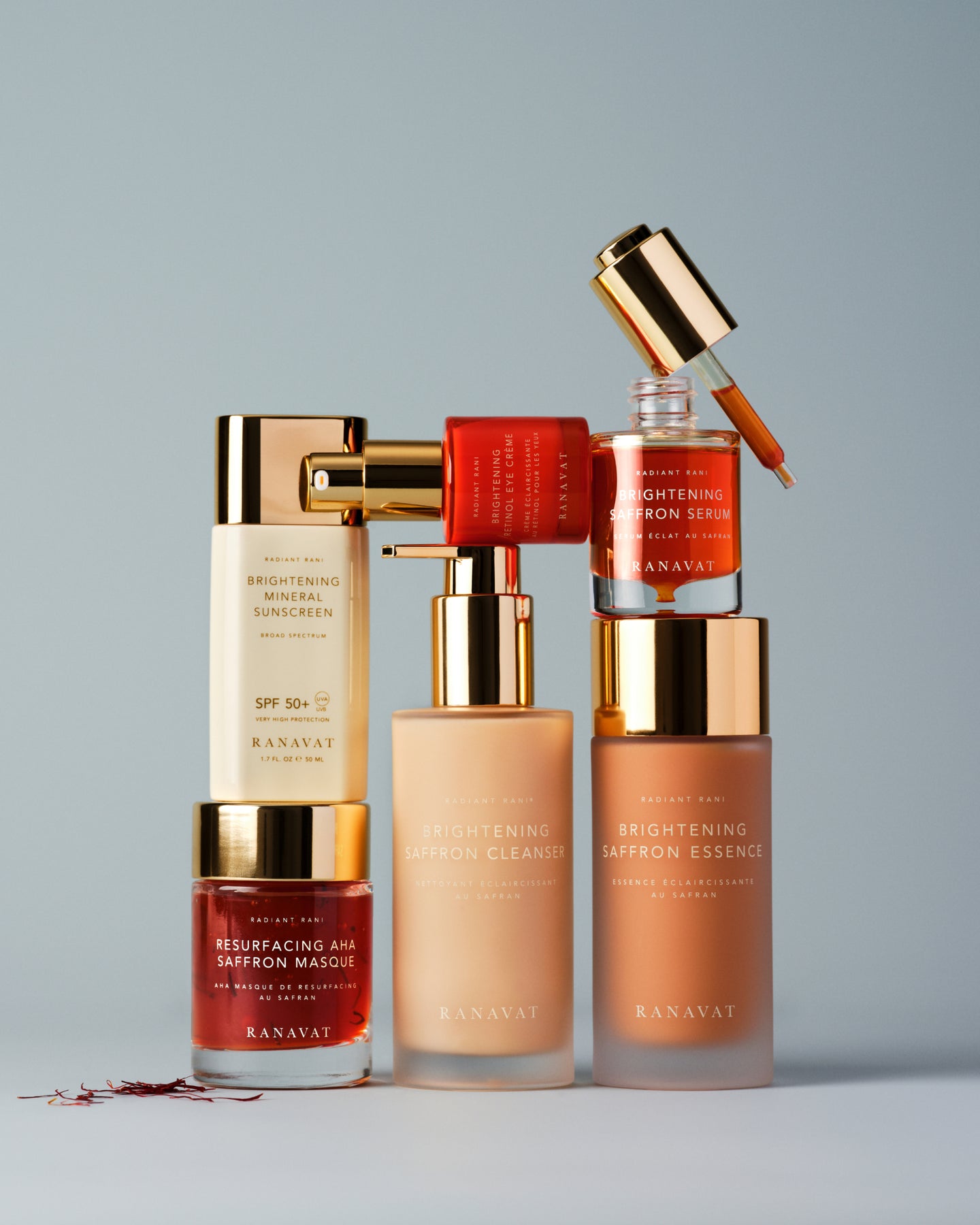 The Complete Saffron Collection hydrates, brightens, treats dark spots, resurfaces & protects. Layer the saffron ritual for a more even skin tone, fading the appearance of dark spots, fine lines and wrinkles. Our new Brightening Mineral Sunscreen SPF 50+ protects against harmful UVA/UVB rays.